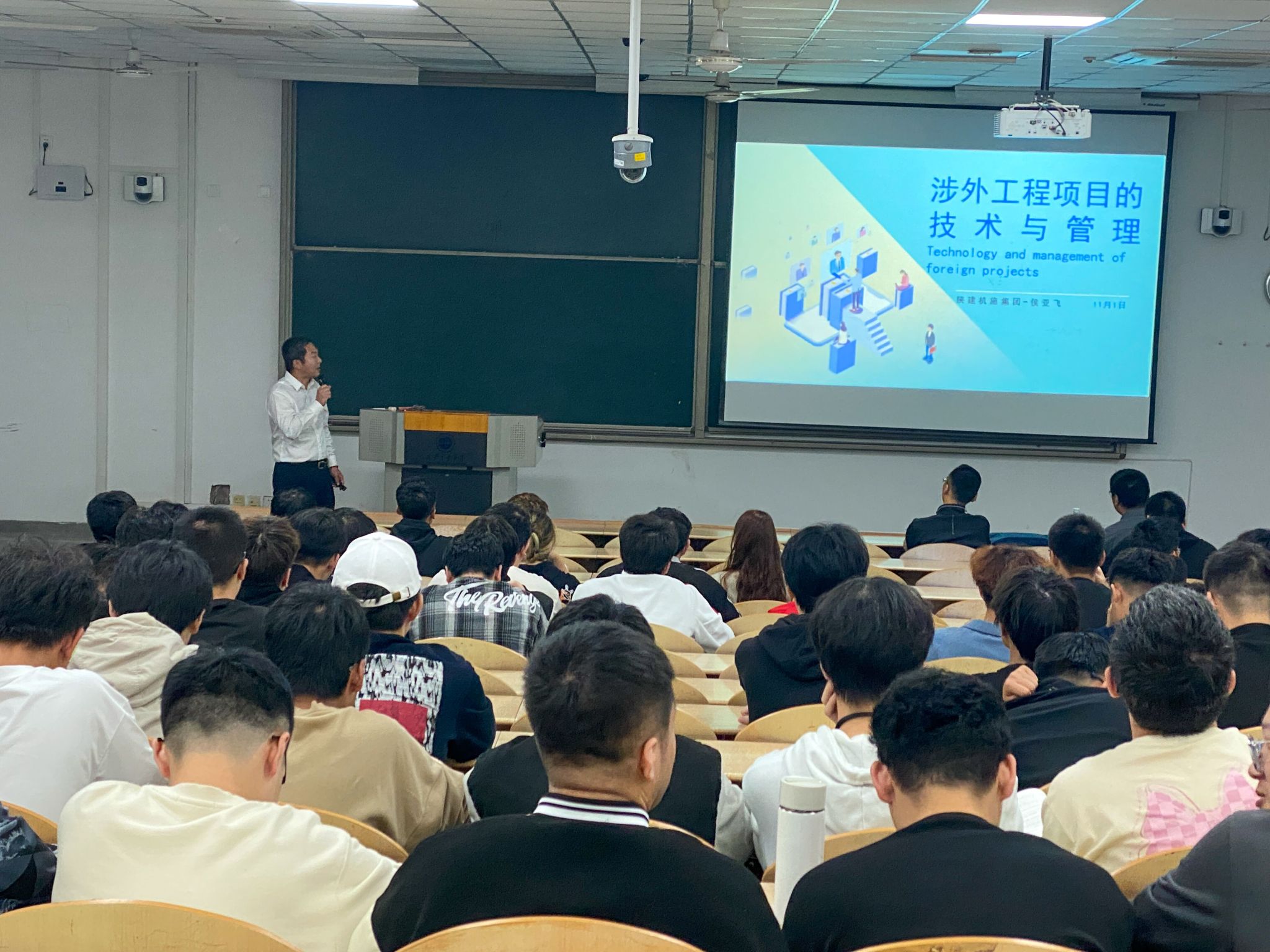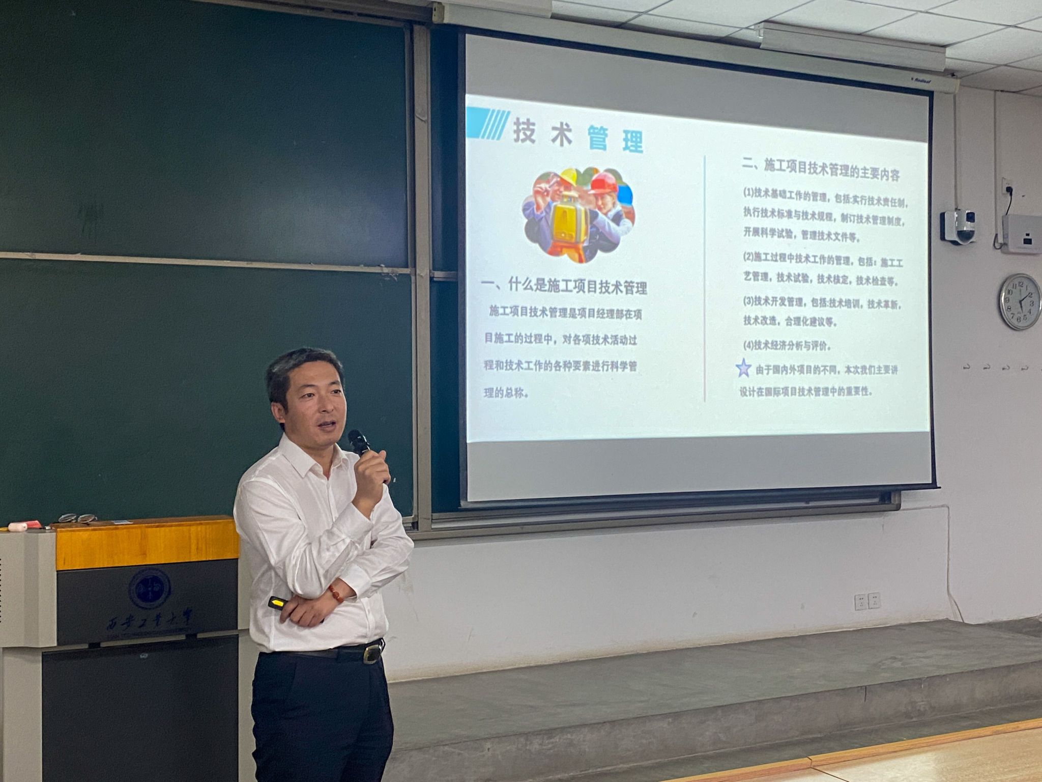 接下来,校友侯亚飞向与会师生作了题为“涉外工程项目的技术与管理”的分享。他结合自己的求学经历和工作经验,从项目概述、技术管理、合同管理、施工管理、人员管理五个方面进行讲解。其中,对技术管理与合同管理做了重点阐述。在技术管理方面,侯亚飞详细讲述了海外工程项目的流程,强调了设计在施工中的重要性,海外项目不能如国内的施工项目一样,先全部完成设计图纸阶段再进入到施工阶段,而需要采用设计、施工同时进行的方式。项目需要首先进行项目设计,然后进行设计报批,只有获得批准的图纸才能作为施工图纸最终用于施工。