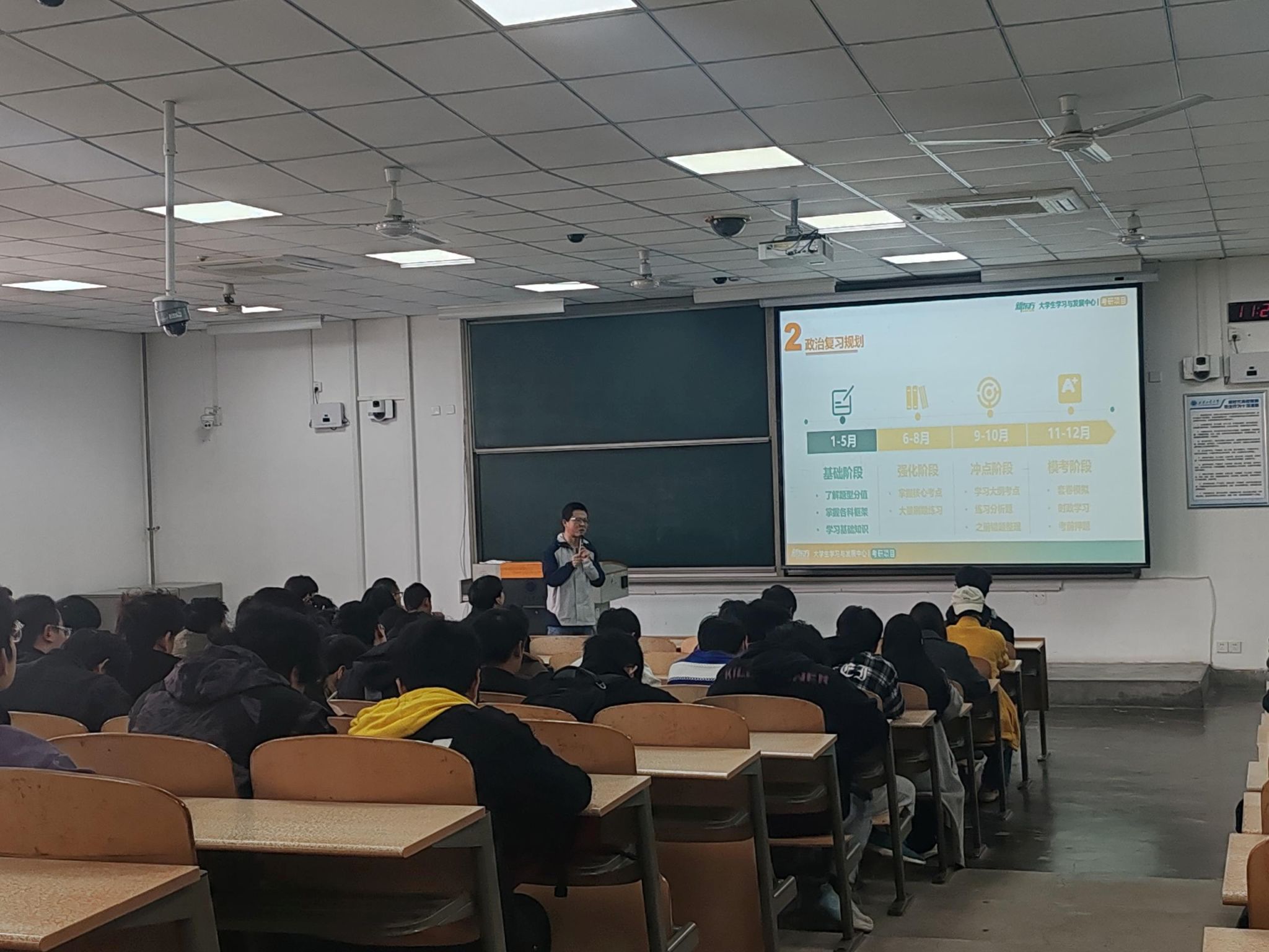 讲座围绕27考研最新政策解读、院校专业选择策略、全程复习规划、公共课与专业课备考要点等学生普遍关注的问题展开。讲师通过详实的数据分析和案例讲解,为同学们梳理了考研备战的时间线与关键节点,并就高效复习方法与应试技巧进行了分享。在互动环节,同学们结合自身情况踊跃提问,讲师逐一给予耐心解答,现场交流氛围融洽。