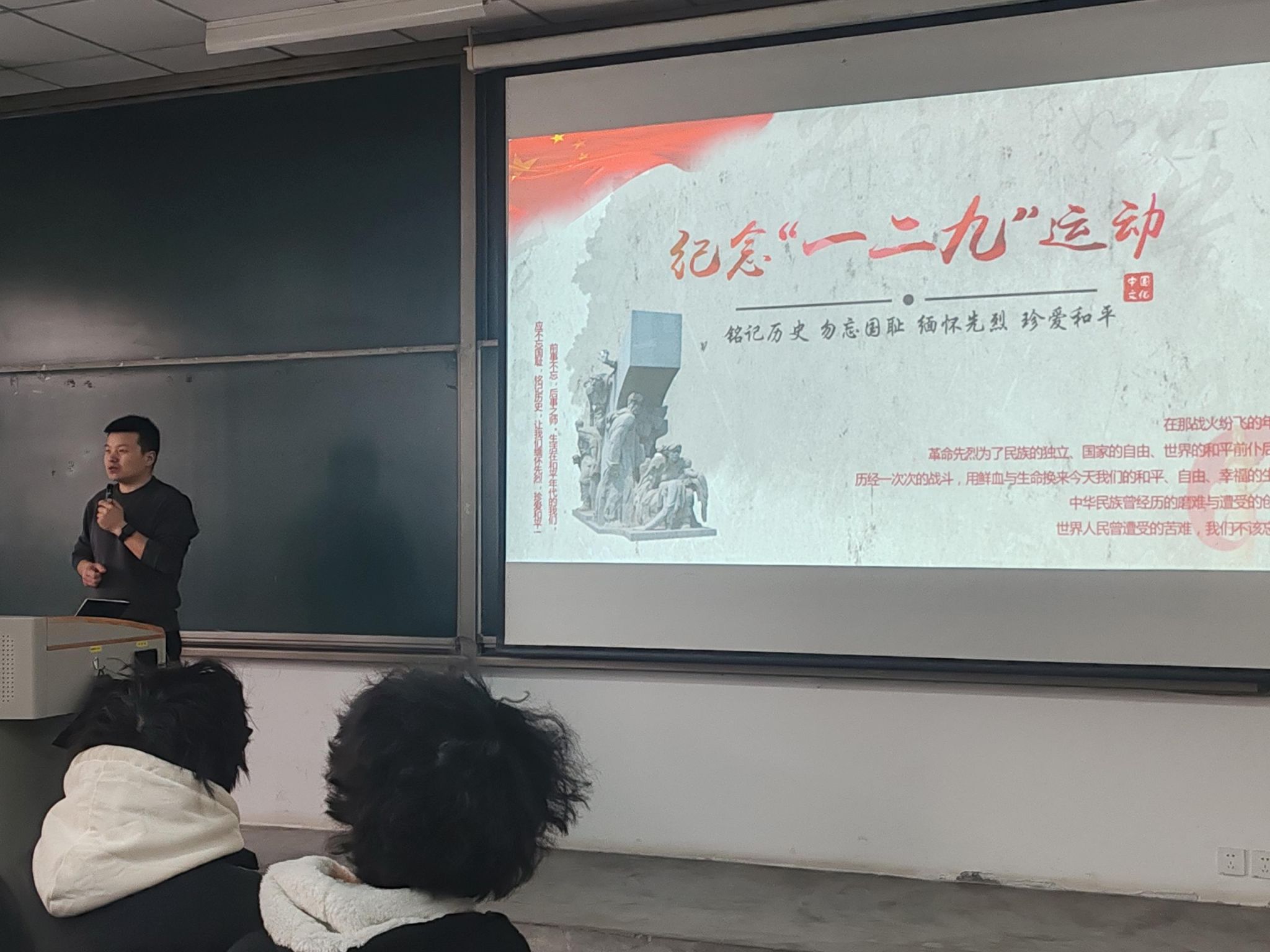 紧接着,刘冬带领大家重温“一二·九”运动的峥嵘历程,讲述爱国青年们为救亡图存、振臂高呼的英勇事迹。他号召同学们传承先辈们炽热的爱国精神,将个人理想融入国家发展大局,以革命先辈为榜样,把爱国之情化作勤学笃行的实际行动,用青春热血书写新时代的担当。