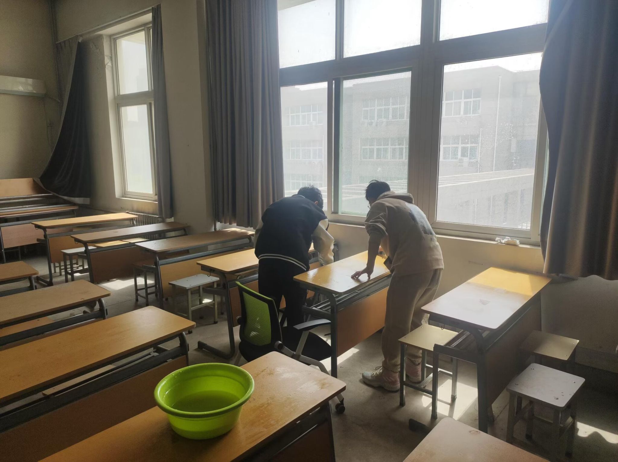 活动过程中,学生分工协作、有条不紊地投入清洁工作。有的拿起抹布仔细擦拭课桌、窗台的灰尘,有的挥动拖把对地面进行全面拖洗,还有的将课桌椅归置整齐、清理角落的杂物,大家以认真细致的态度完成每一项清洁任务,教4-413的环境在大家的努力下焕然一新。